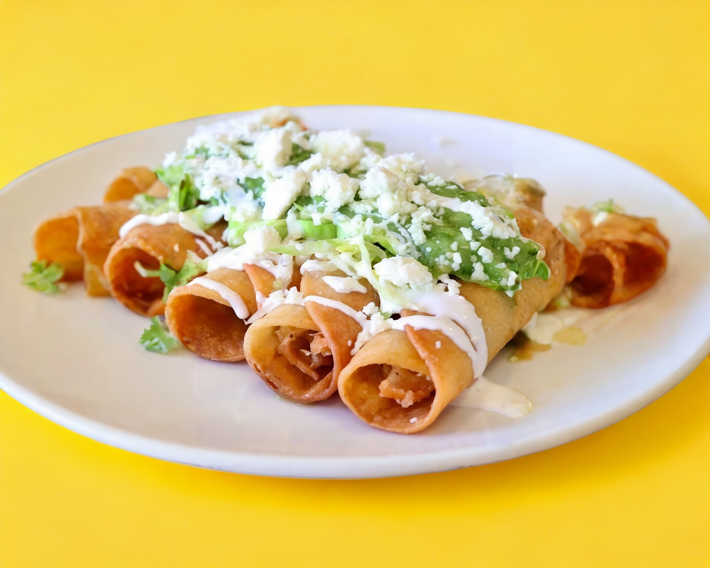 5 TACOS DORADOS DE POLLO ACOMPAÑADOS DE LECHUGA QUESO SALSA Y CREMA