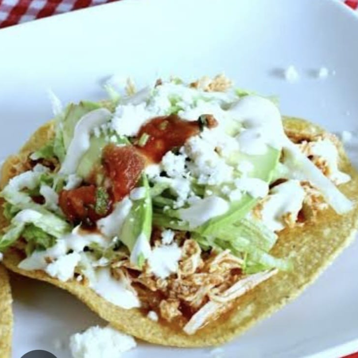 ORDEN DE 3 : Tostada crujiente de maíz, pollo deshebrado a la mexicana, frijoles refritos negros, lechuga fresca, crema, queso rallado y salsa al gusto.