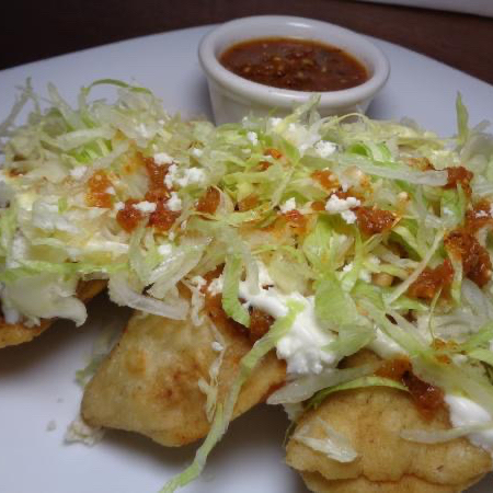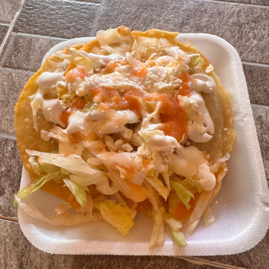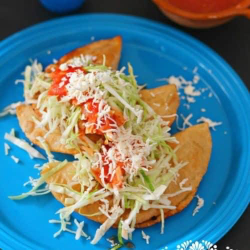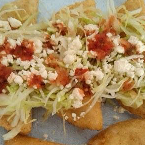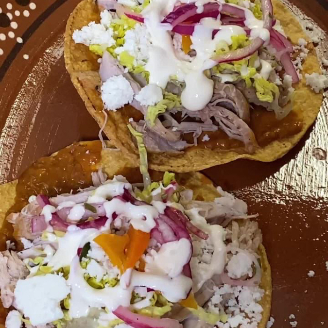 Orden de tres tostadas de carne molida con repollo, tomate, cebolla, queso, frijoles, media, crema y salsa roja