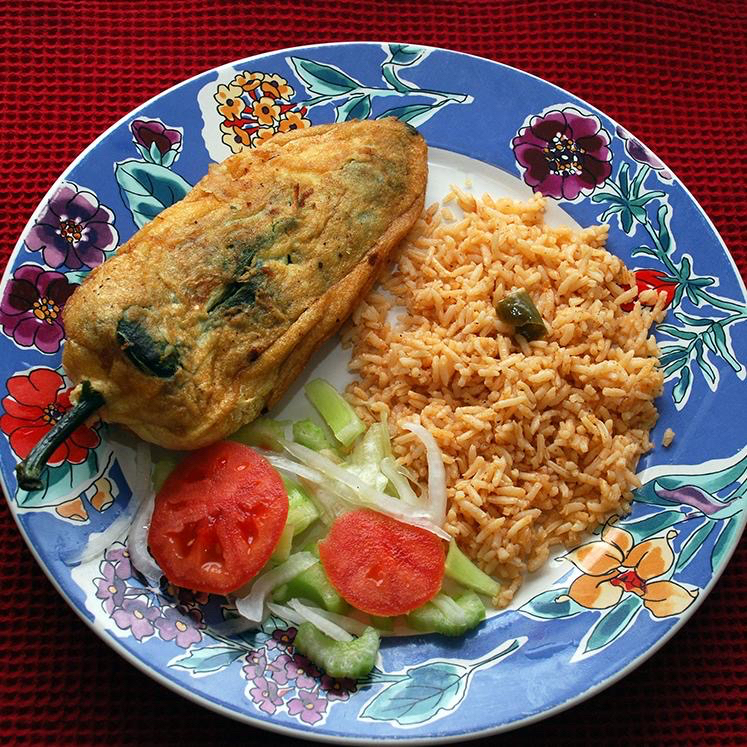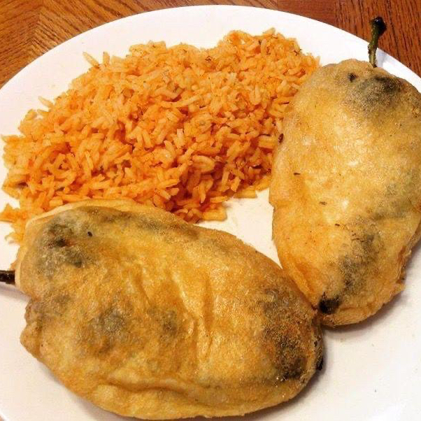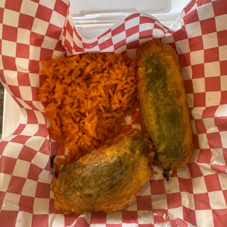2 Chiles Rellenos de Queso,con Arroz y Tortillas