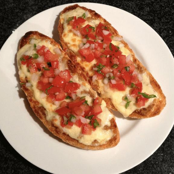 Orden de 2 molletes con mantequilla , frijoles,queso tomate y cebolla