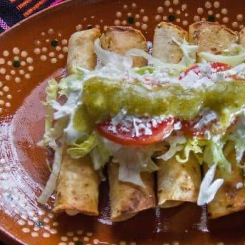 Cuatro tacos dorados de pollo con repollo, tomate, tomate,cebolla, y queso