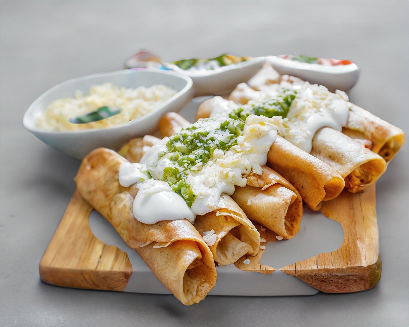 6 tacos dorados, o flautas, son tortillas de maíz rellenas de carne o pollo, enrolladas y fritas hasta quedar crujientes, generalmente acompañadas de salsa, crema y guarniciones.