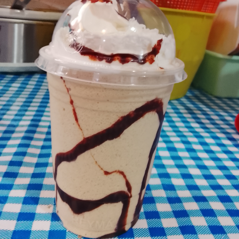 Bebida frappeada con base sabor cafe, adornada con crema batida y chocolate hershey´s y una galleta wafer stick de chocolate