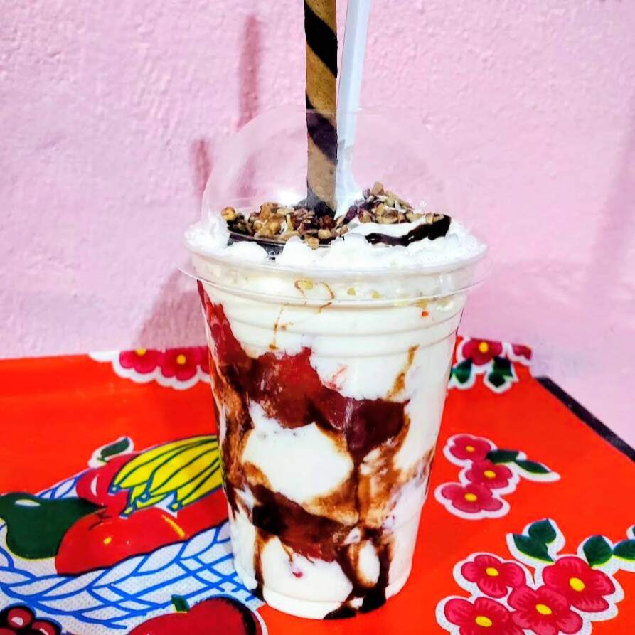 Fresas naturales congeladas con crema preparada, llevan chocolate, nuez, crema batida.