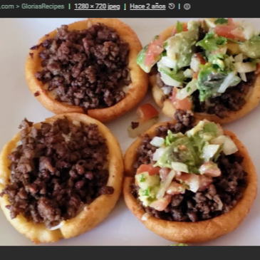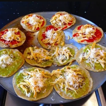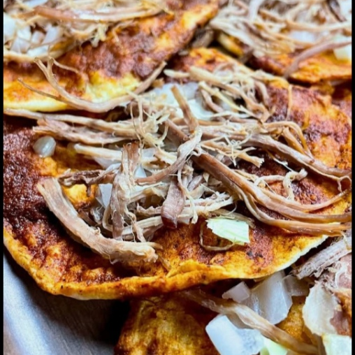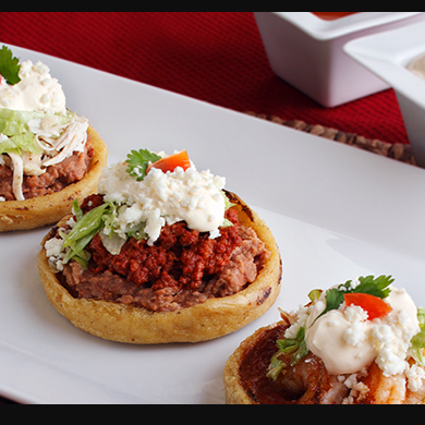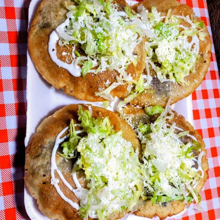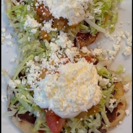 masa de maíz, con un relleno de carne molida a la mexicana. Acompañadas de lechuga, crema y queso cotija espolvoreado.