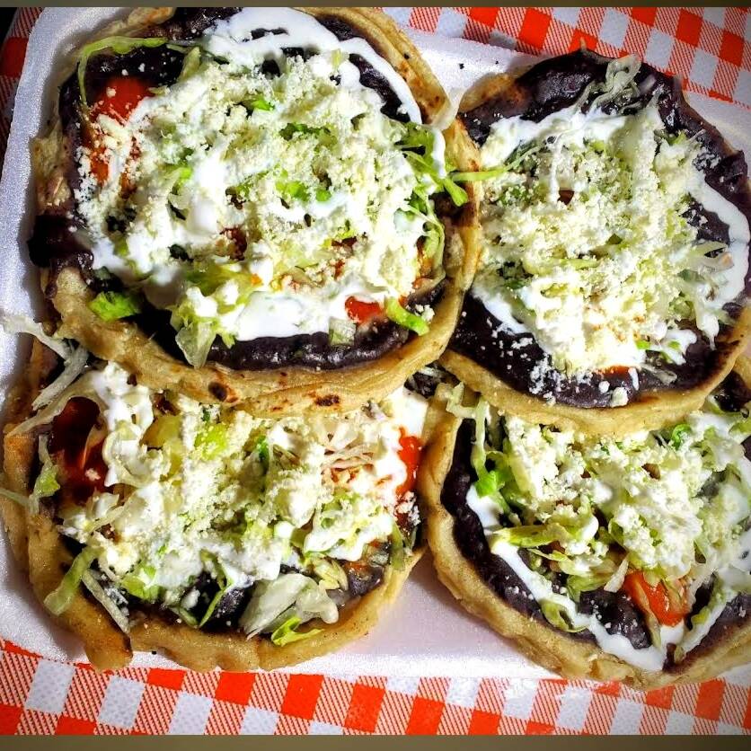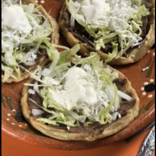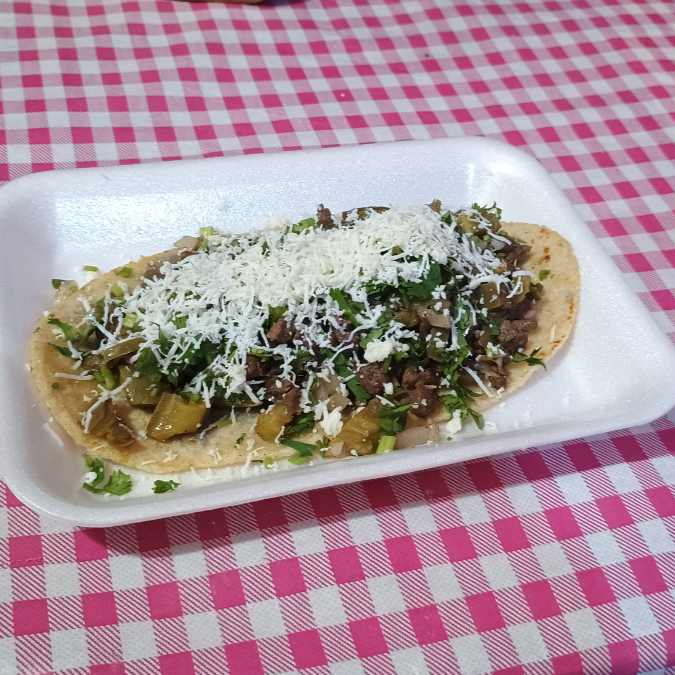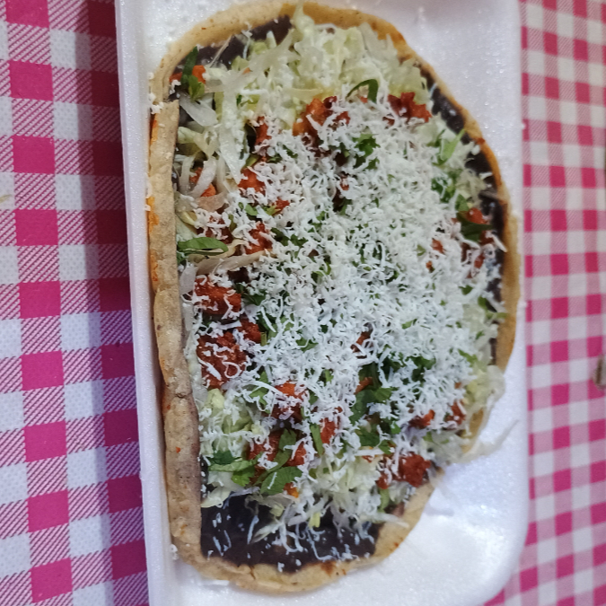 Tortilla de maíz gruesa pellizcada de las orillas, cocida en el comal, con una capa de frijolitos negros, acompañado de lechuga, cebolla, carde de bistec de res, con cilantro y queso fresco rayado.