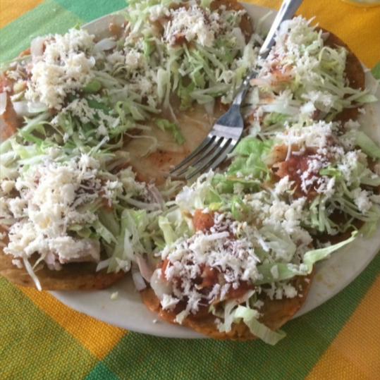 Tortilla de maíz pasada por aceite, con una capa de frijolitos negros, con cebolla, lechuga, pechuga de pollo desmenuzada, con cilantro, crema y queso cotija espolvoreado