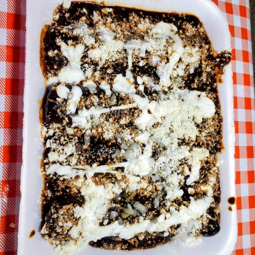 Tortilla de maíz pasada por aceite, bañada en mole, se rellena de pechuga de pollo deshebrado, acompañada con cebolla, crema y queso cotija espolvoreado.