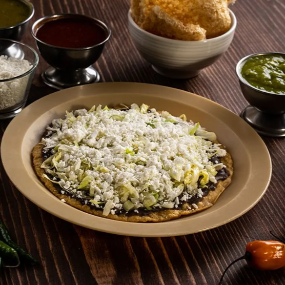 Tortilla de maíz gruesa con las orillas pellizcadas, lleva una capa de frijolitos negros, acomparañadas de cebolla, cilantro y queso cotija espolvoreado.