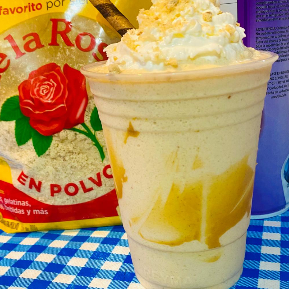 Bebida frappeada elaborada con mazapan de la Rosa, decorado con crema batida, y mazapan espolvoreado con su galleta wafer stick de chocolate