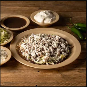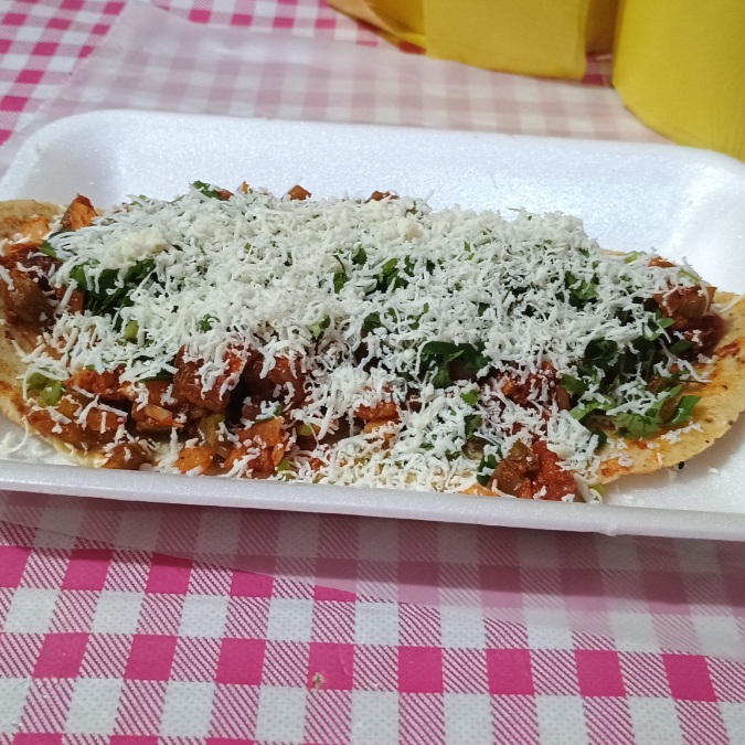 Tortilla de maíz pasada por aceite, con una capa de frijolitos negros, acompañado de cebolla, lechuga, carne de res deshebrada, cilantro, crema y queso cotija espovoreado.