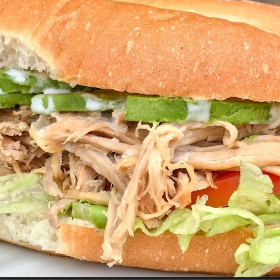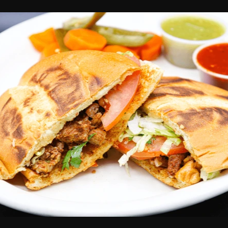 Pan para torta a la mitad, en la tapa lleva mayones y queso de hebra gratinado, en la base lleva mayonesa y frijolitos negros, con carne de puerco enchilada, con lechuga, tomate, aguacate y aceite de oliva.