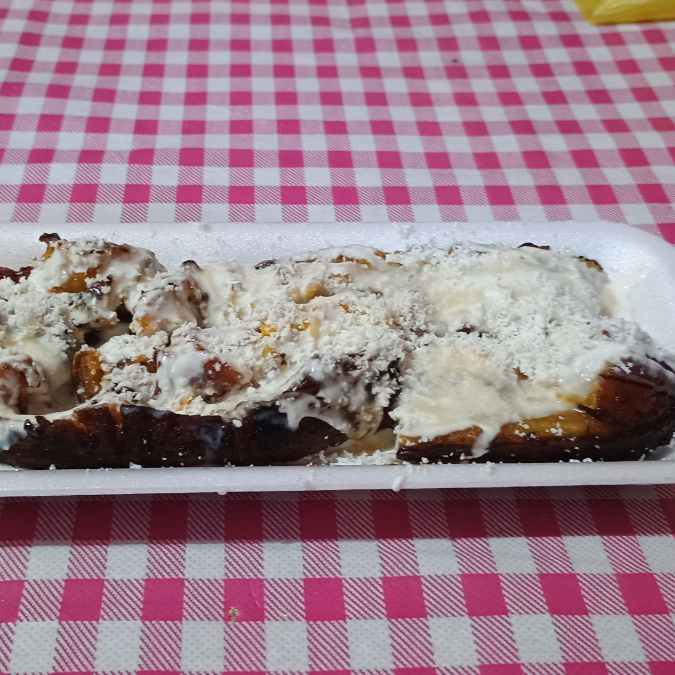 Platano macho frito en aceite, acompañado de crema, lechera y queso cotija espolvoreado.
