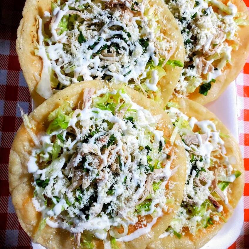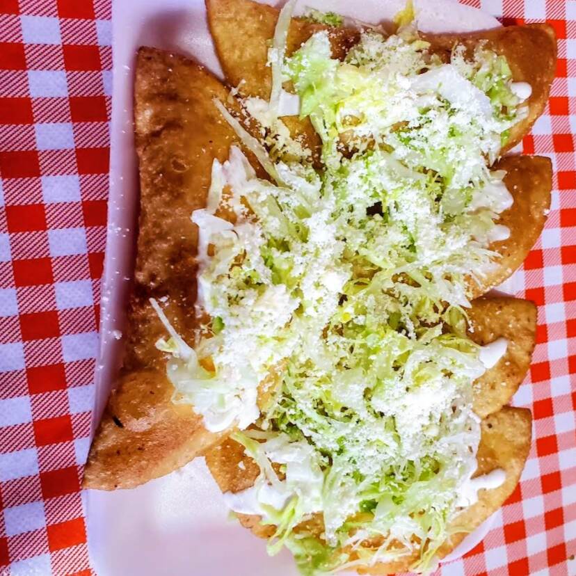 Masa de maíz rellenas de pollo a la mexicana, se cocina frita, acompañada de lechuga, crema, salsa verde y queso Cotija espolvoreado.