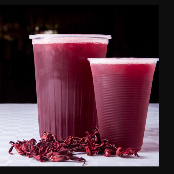 Agua natural de concentrado de jamaica, endulzada con azúcar, lleva hielo, vaso de 1 lt.
