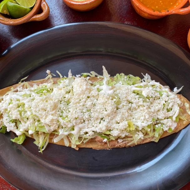 Tortilla de maíz gruesa pellizcada de las orillas, cocinada en comal, con una base de frijol con lechuga, cebolla, cilantro y queso fresco rayado.