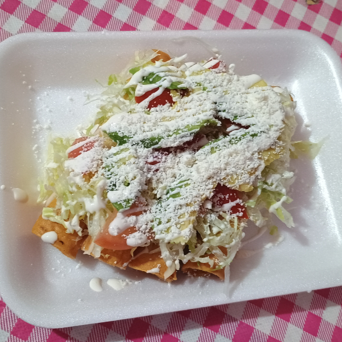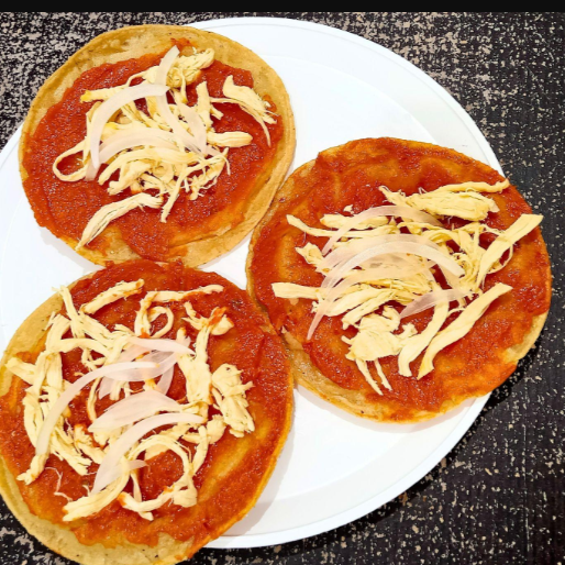 Tortilla de maíz pasada por aceite, con una capa de mole acompañada de cebolla, lechuga, pechuga de pollo desmenuzada, cilantro, crema y queso cotija espolvoreado.