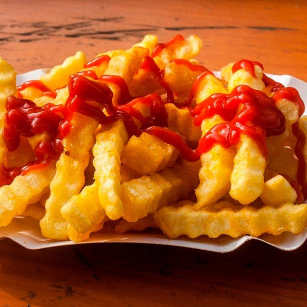 Papas a la francesa, fritas, acopañadas con capsu y queso amarillo