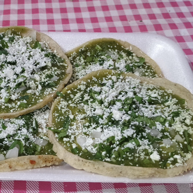Orden de 4 picaditas de maíz (tortilla gruesa pellizcada de las orillas), con una capa de salsa verde, acompañadas de cebolla, cilantro, y queso cotija espolvoreado.