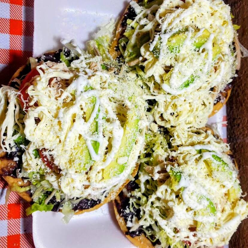 Orden de 3 tostadas de maíz, con una base de frijol negro, lechuga, pechuga de pollo desmenuzada, tomate, queso Oaxaca (hebra), aguacate, salsa de la casa, crema y queso cotija espolvoreado.
