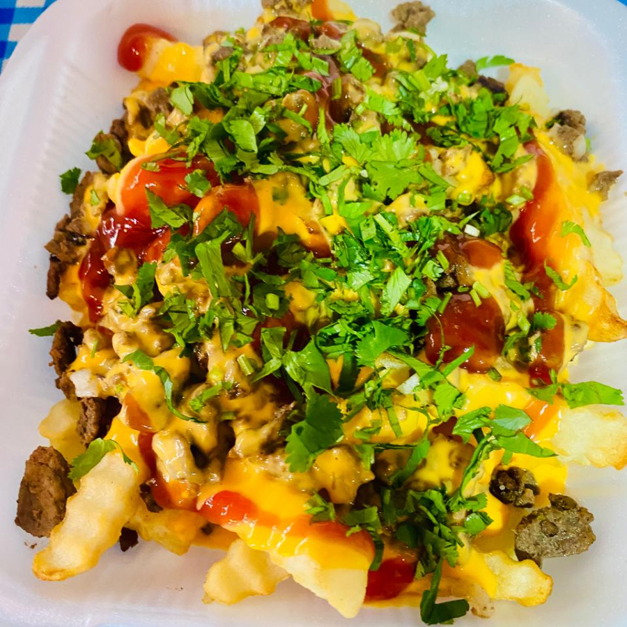 Papas a la francesa preparadas con bistec de res, queso amarillo, catsup y cilantro