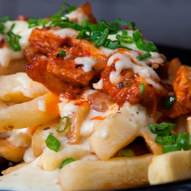 Papas a la francesa preparadas con carne enchilada, queso amarillo, crema y cilantro