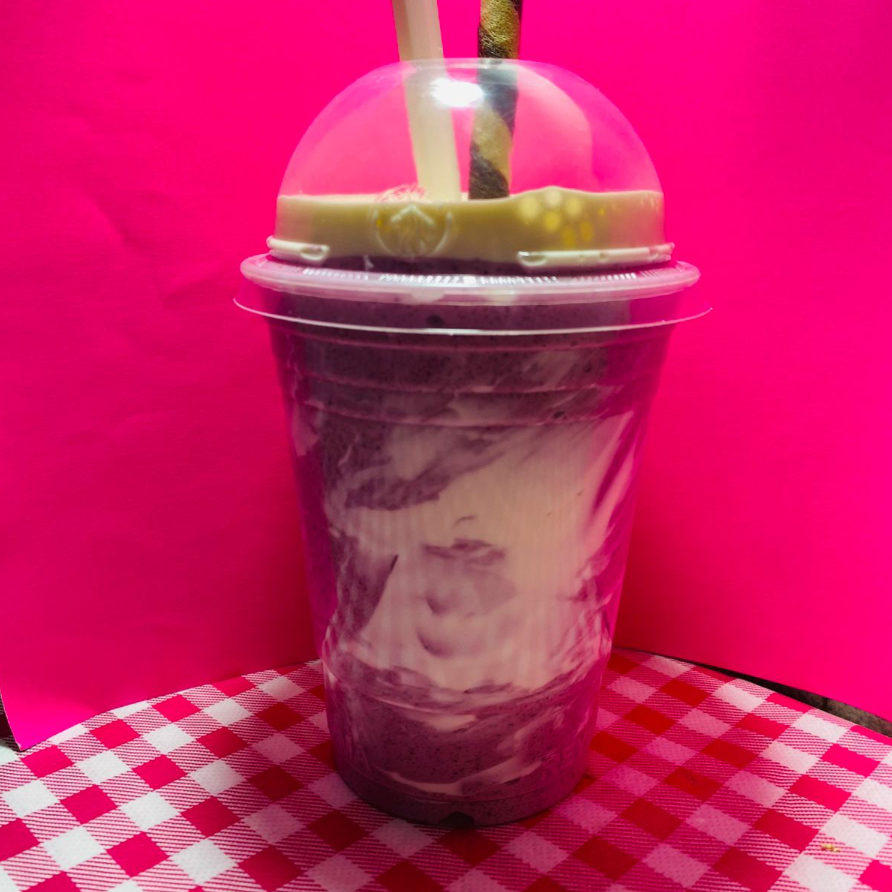 Bebida frappeada preparada con frutos rojos 100 % naturales, adornada con crema batida y una galleta wafer stick de chocolate