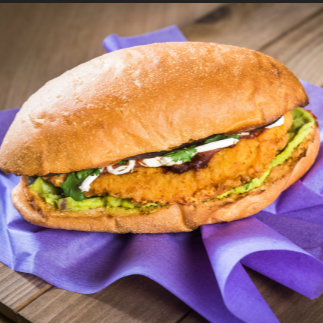Pan para torta a la mitad, en la tapa lleva mayonesa y queso de hebra gratinado, en la base lleva mayonesa, frijolitos negros, milanesa de pollo empanizada, con lechuga, tomate, aguacate y aceite de oliva.
