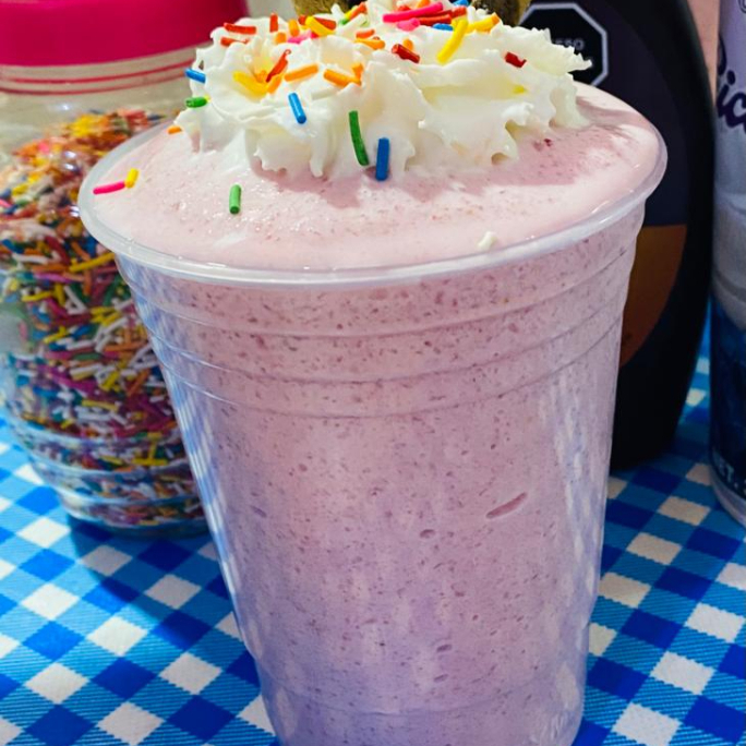 Bebida frappeada preparada con fresas 100% naturales, adornada con crema batida y una galleta wafer stick de chocolate y chispitas de colores