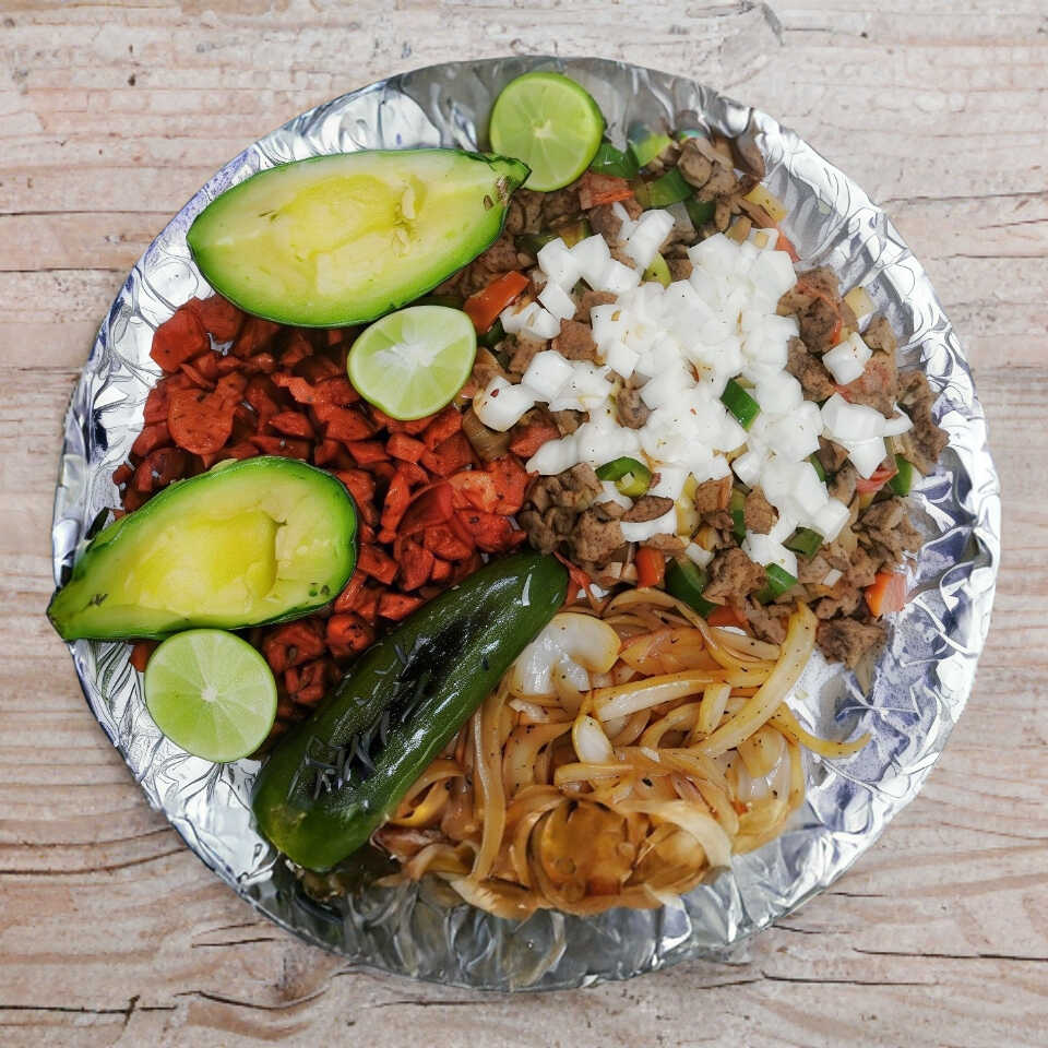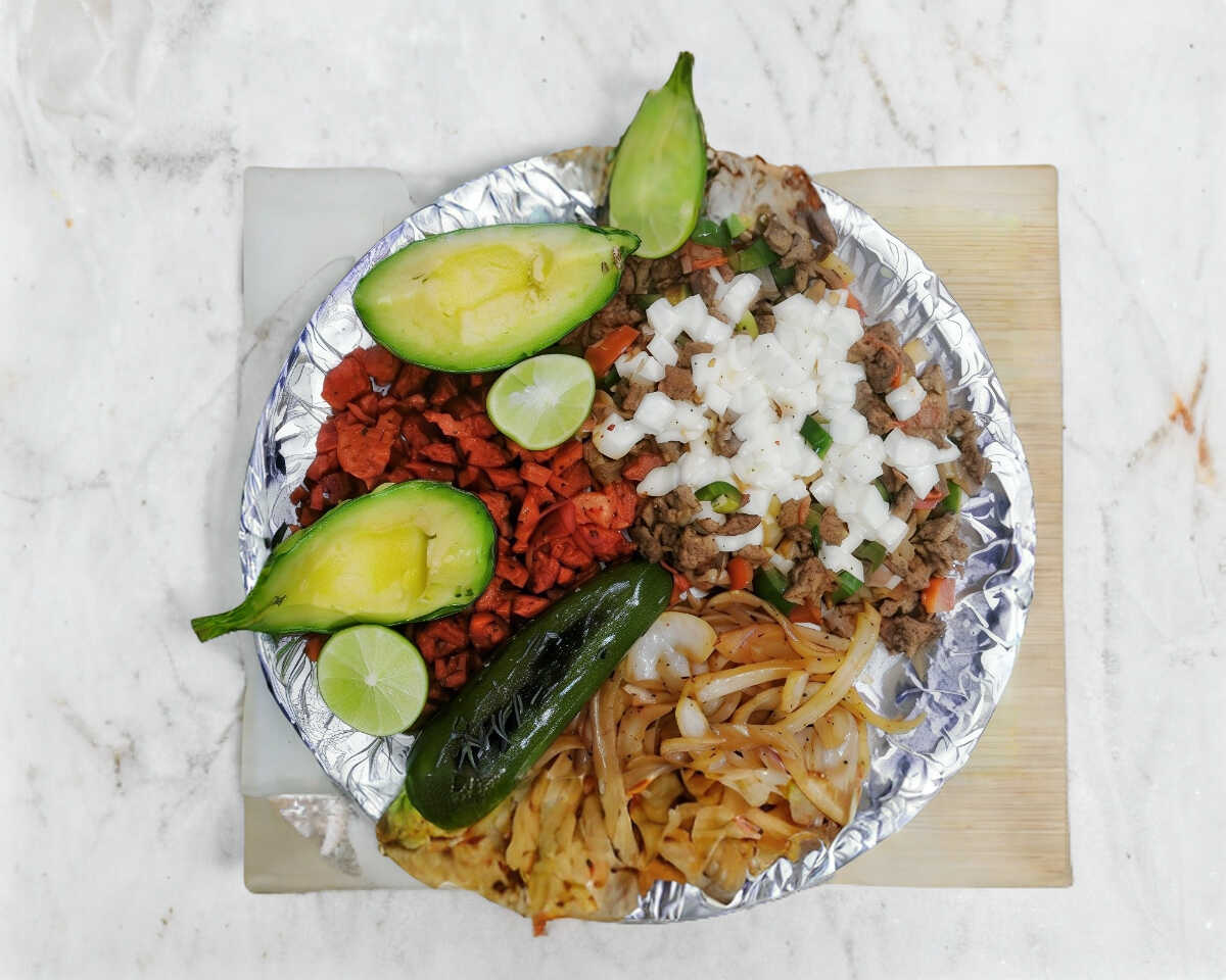 Combinación de 2 carnes (pastor, bistec o alambre), aguacate, limones, cebolla asada, chiles toreados y tortillas.
