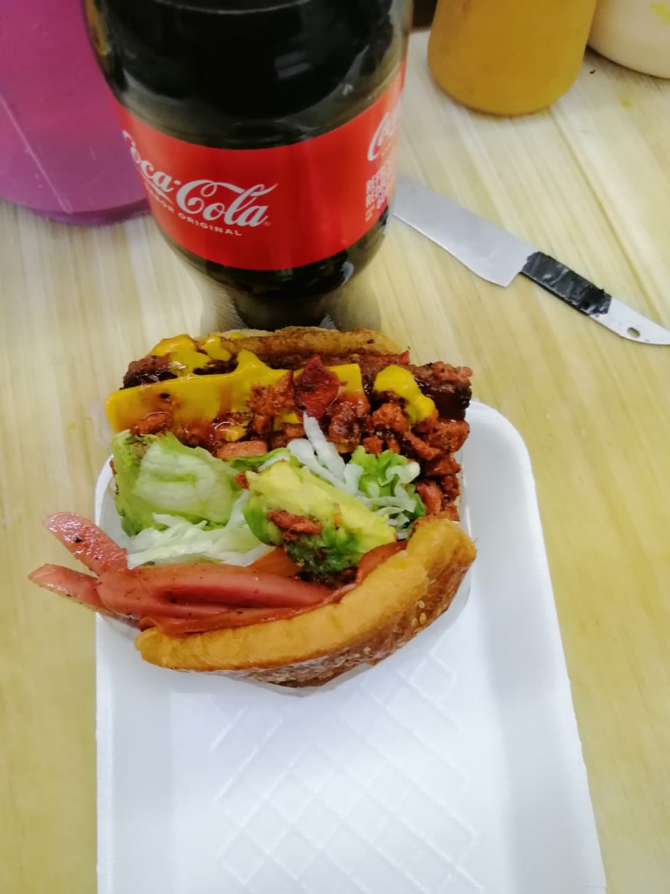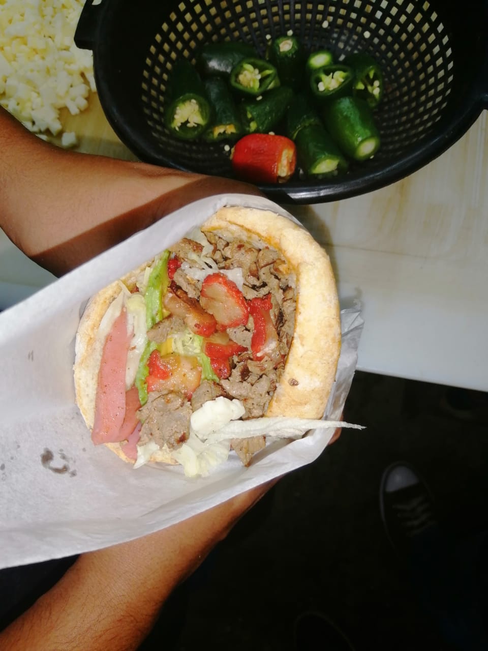 Bistec, pastor, colita de pavo, lechuga, tomate, aguacate, mayonesa, winnie, jamón, aparte lleva salsa verde o roja.
