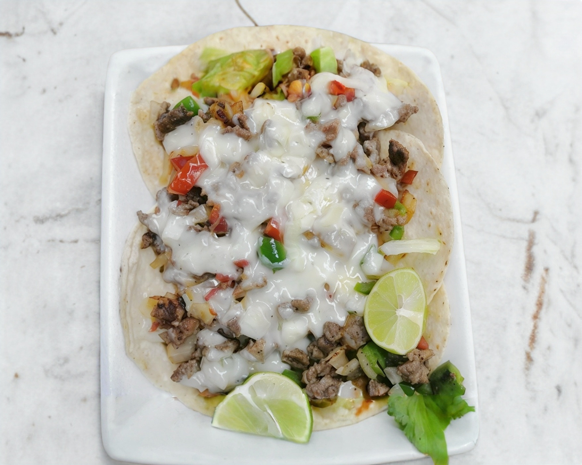 Tortilla grande de harina bistec a la mexicana, queso, aparte lleva salsa verde o roja.