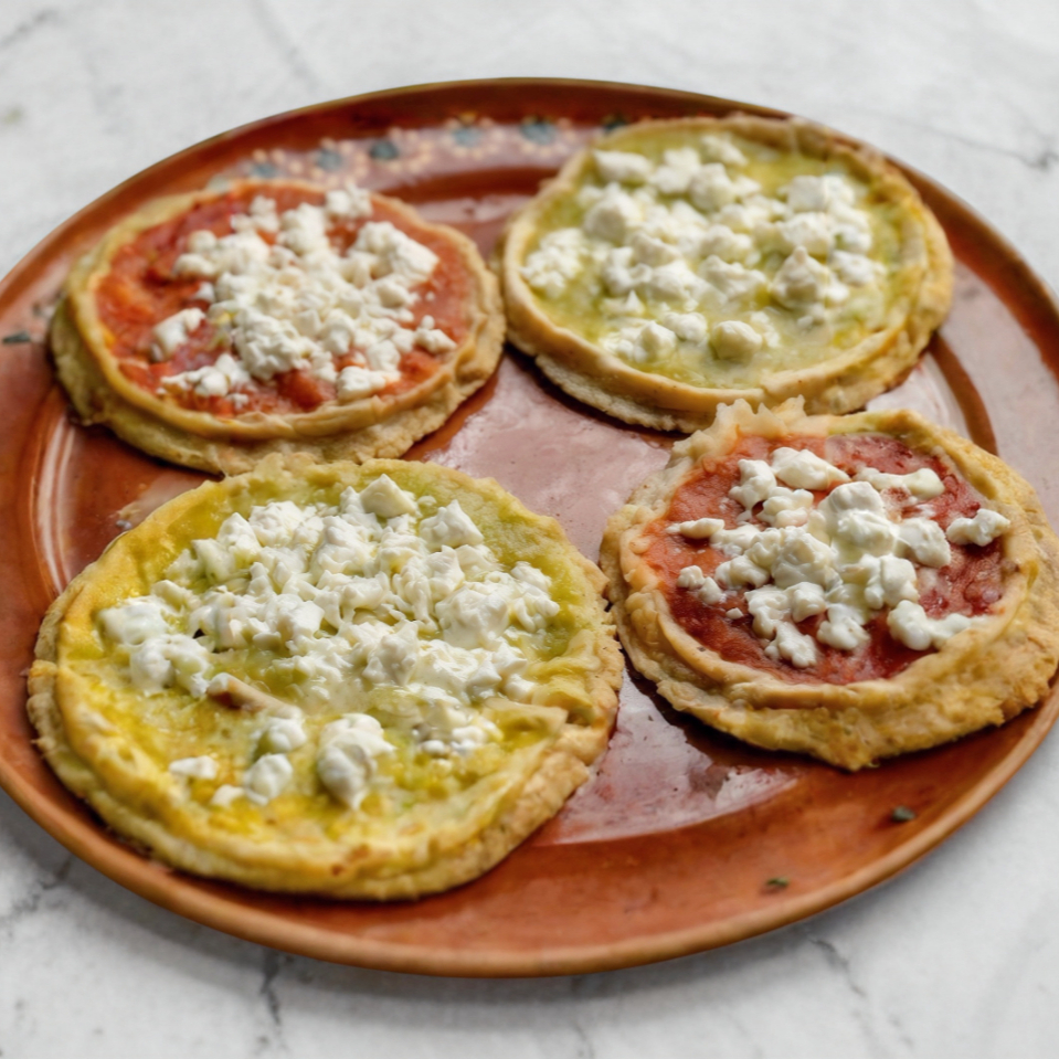 4 picaditas de Masa en comal cubierta de salsa o frijoles con cebolla y queso