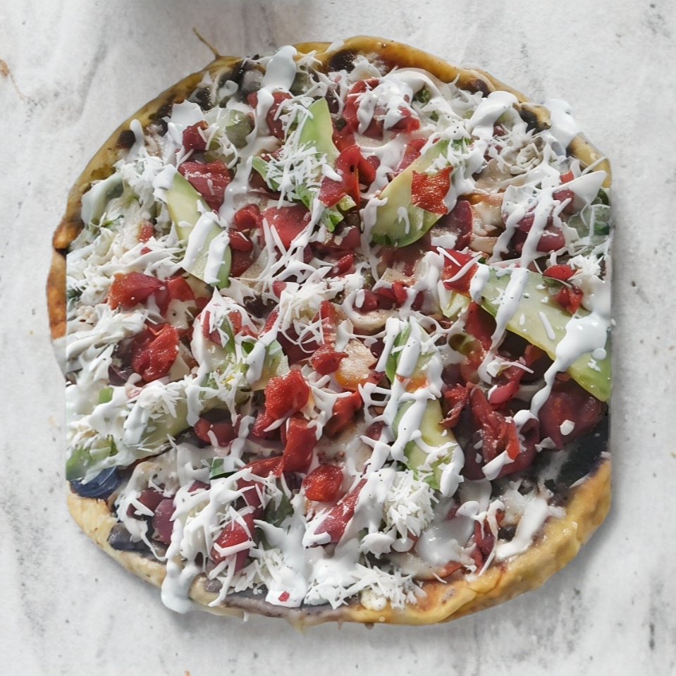 4 gordas rellena de frijoles y cubierto con lechuga, crema y queso
