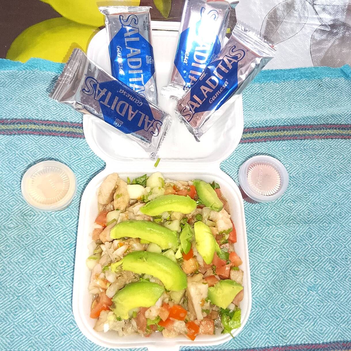 Pepino, cebolla, cilantro, aguacate, acompañado de 4 paquetitos de galleta y salsa habanera