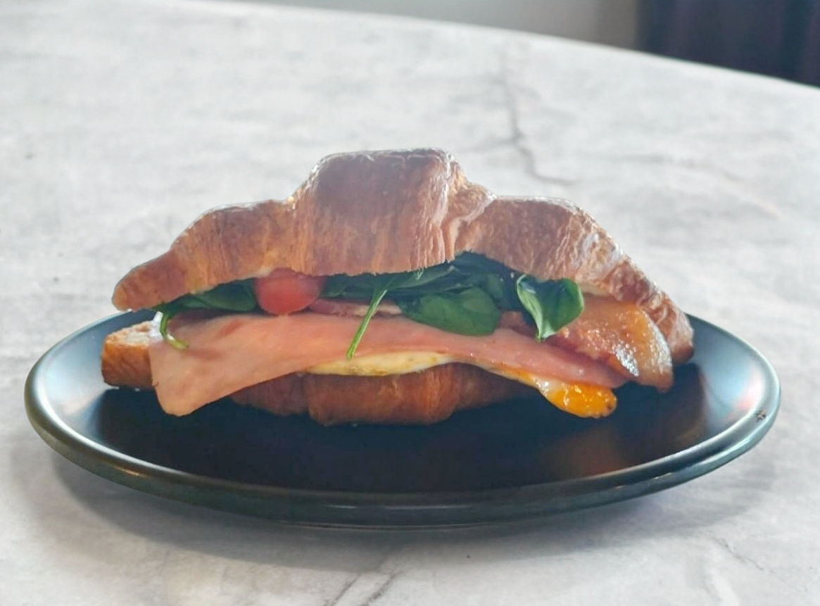 Jamón, huevo, tocino, mayonesa, tomate cherry y espinacas.