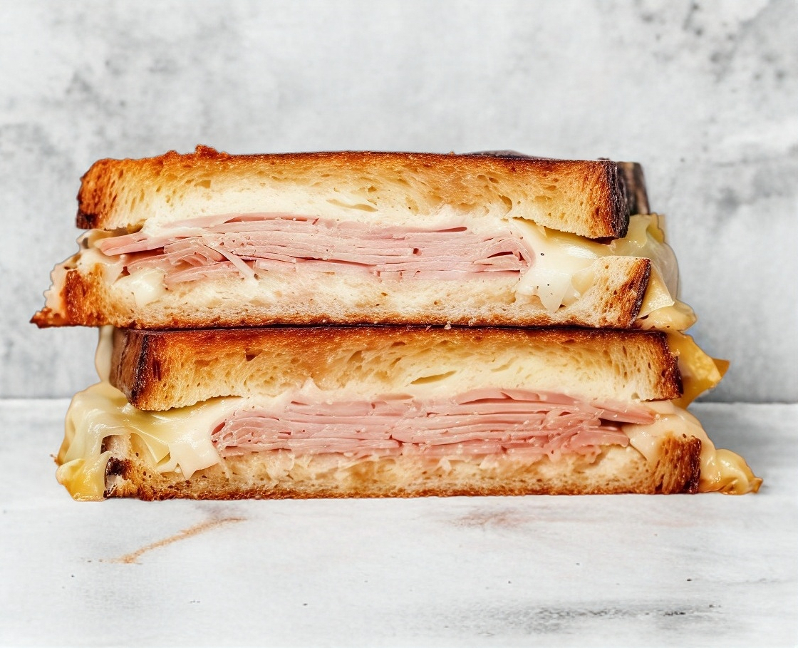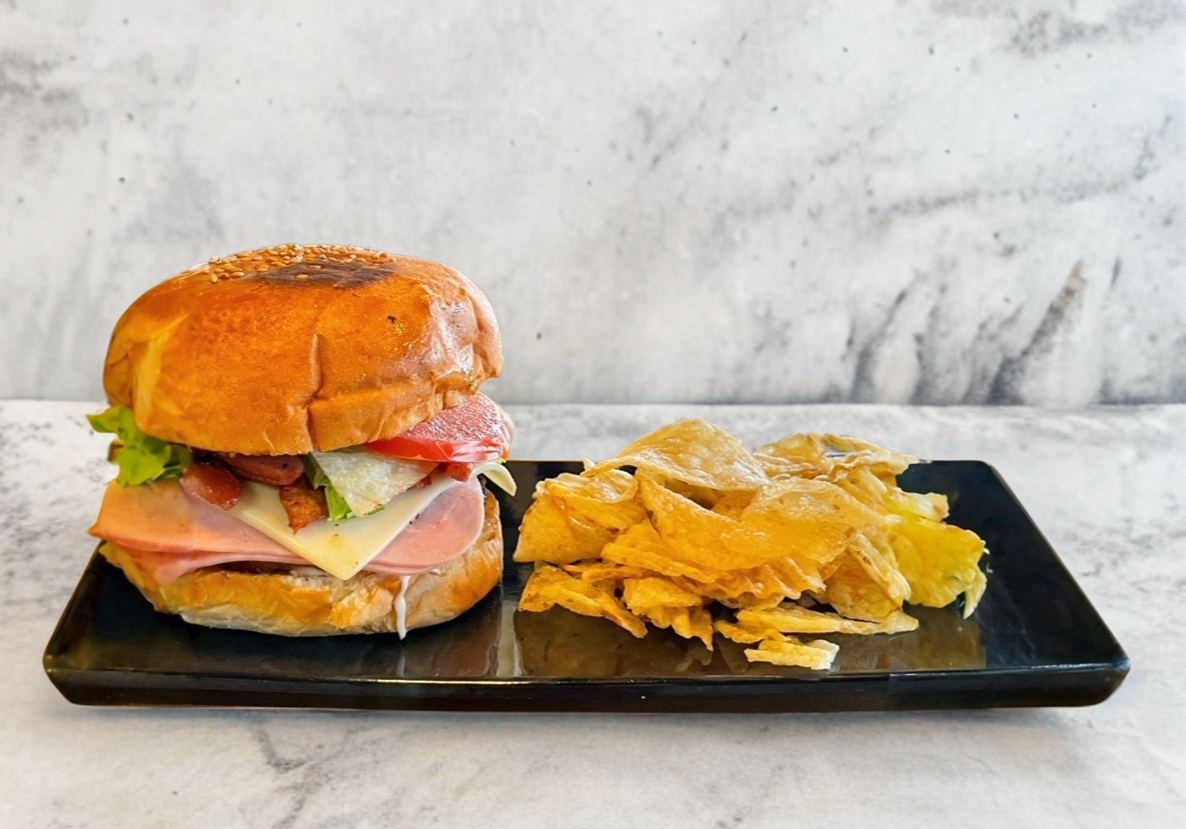 Jamón, queso y tocino, pan de caja acompañado con papas.