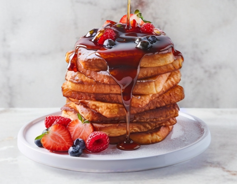 Acompañado con fresas naturales y espolvoreado con azúcar glass. Incluye Miel de Maple (aparte)