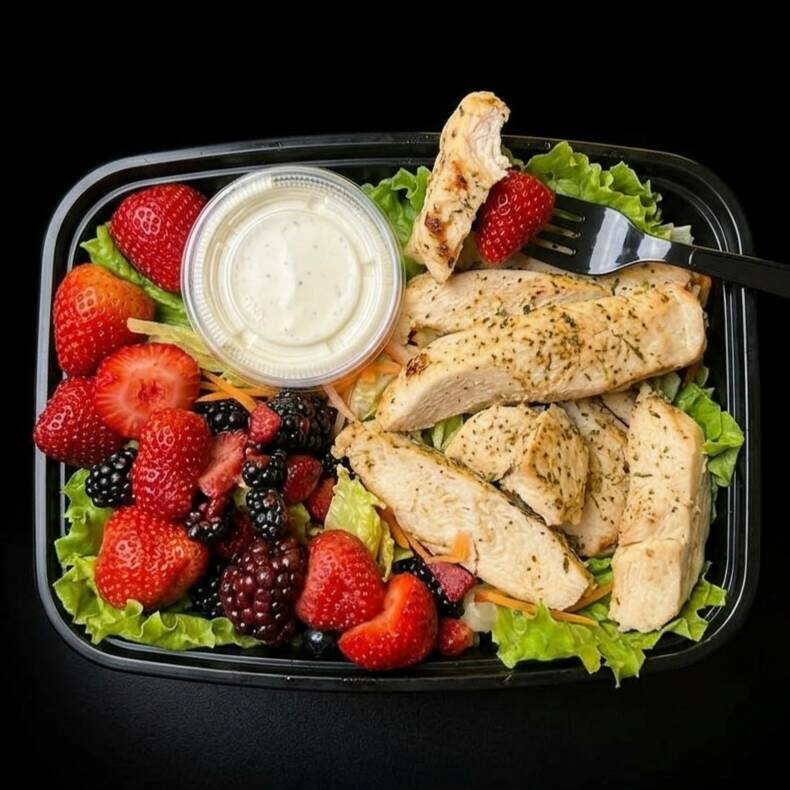 Deliciosa Pechuga a la plancha con lechuga y frutos rojos dela natraleza, acompañada de vinagreta, ranch y salsa de su eleccion