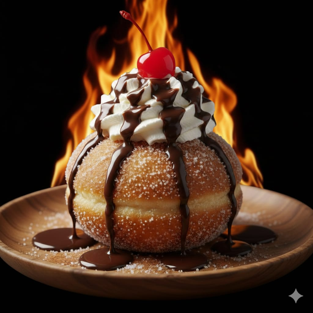 Deliciosa nieve frita cubierta con azúcar y canela acompañada con frutos rojos, chantillí y un toque de chocolate