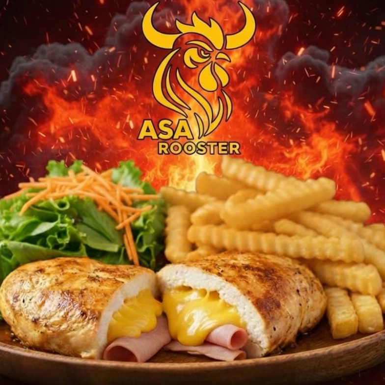 Una deliciosa Pechuga Rellena de Jamon y Queso, acompañada con ensalada, papas fritas, cátsup, Ranch y salsa de su eleccion