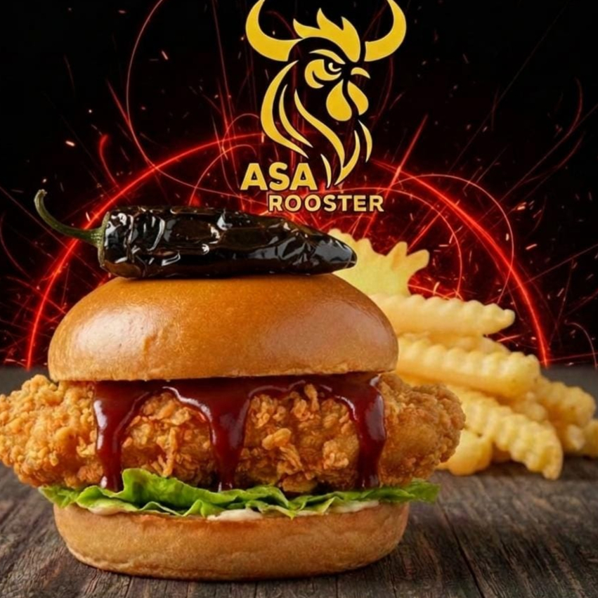 Deliciosa Hamburguesa de pollo acompañada de papas fritas, catsup, ranch y salsa de su elección