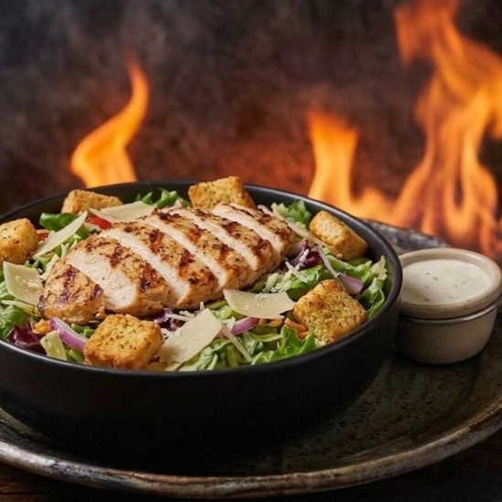 Jugosa Pechuga a la parrilla, ahumada al mezquite, acompañada con lechuga, Crotones, ranch, vinagreta y salsa de su elección