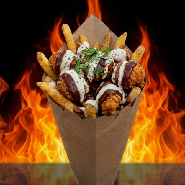 250G de deliciosos Boneless Bañados en Salsa CAJUN, acompañado de ensalada y papas fritas, enviamos cátsup ranch y queso chedar