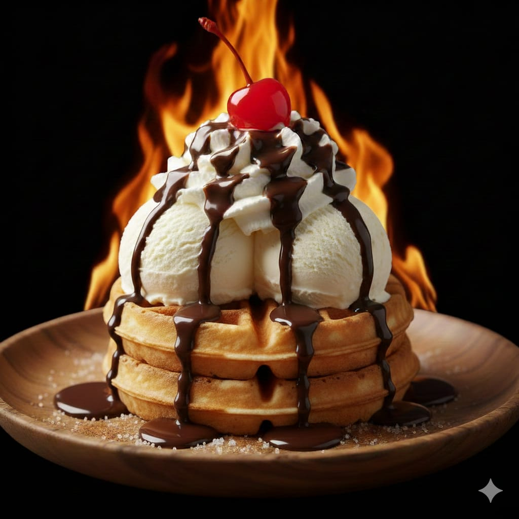 Waffle con mantequilla y encima nieve, chanti y chocolate