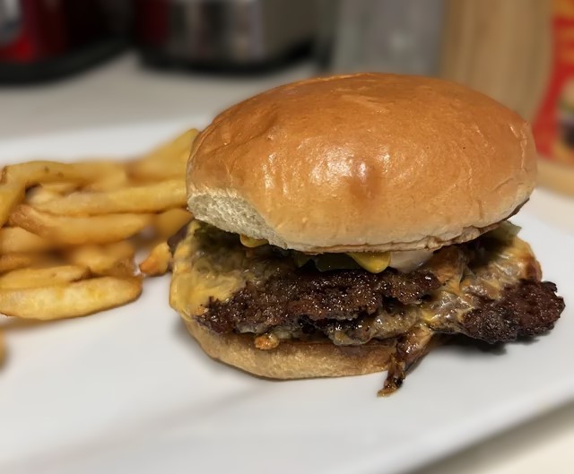 Hamburguesa con 2 carnes delgadas con queso, cebolla caramelizada con mayonesa acompañada de papas fritas especiadas y chiles toreados.