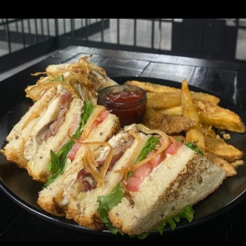 Sandwich de pollo, jamón, tocino, queso, lechuga y tomate acompañado de papas fritas especiadas.