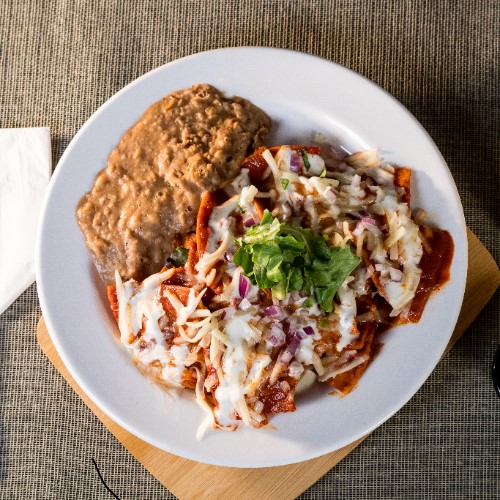 Totopos de maíz bañados en salsa roja con queso, acompañados de frijoles refritos.