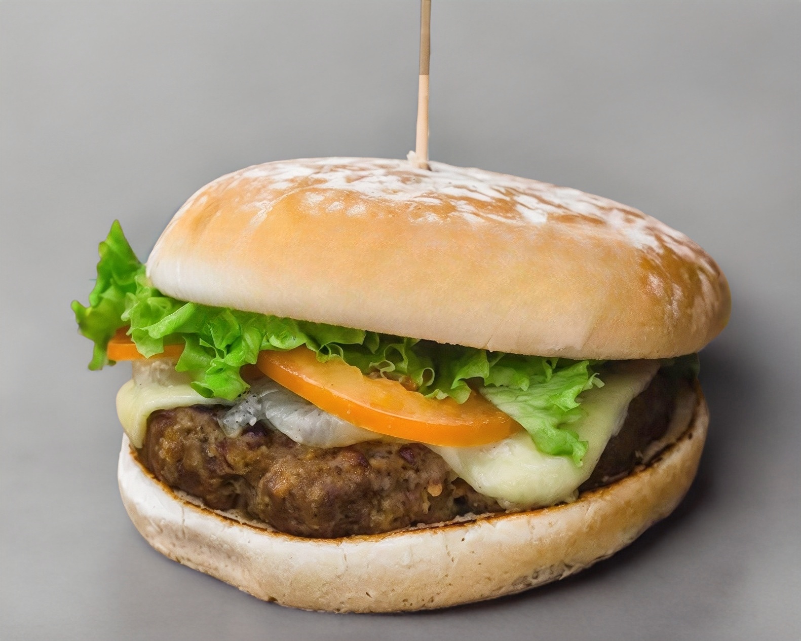 Pan artesanal, una carne de res (120 grs), queso monterrey jack, mix de lechugas, acompañada de papas fritas especiadas.